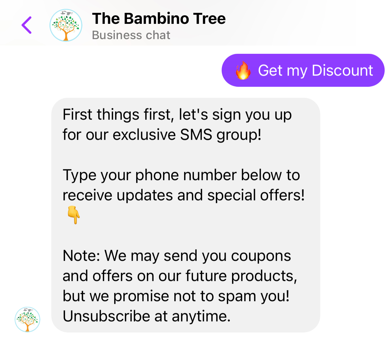 The Bambine Tree, a UK-based educational toy and games brand, uses a chatbot within Facebook Messenger to send special offers to its customers.