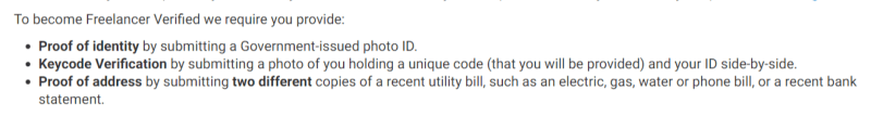 Freelancer—an e-commerce marketplace platform for freelance work—is encouraging its suppliers to verify their identity by providing the following information: