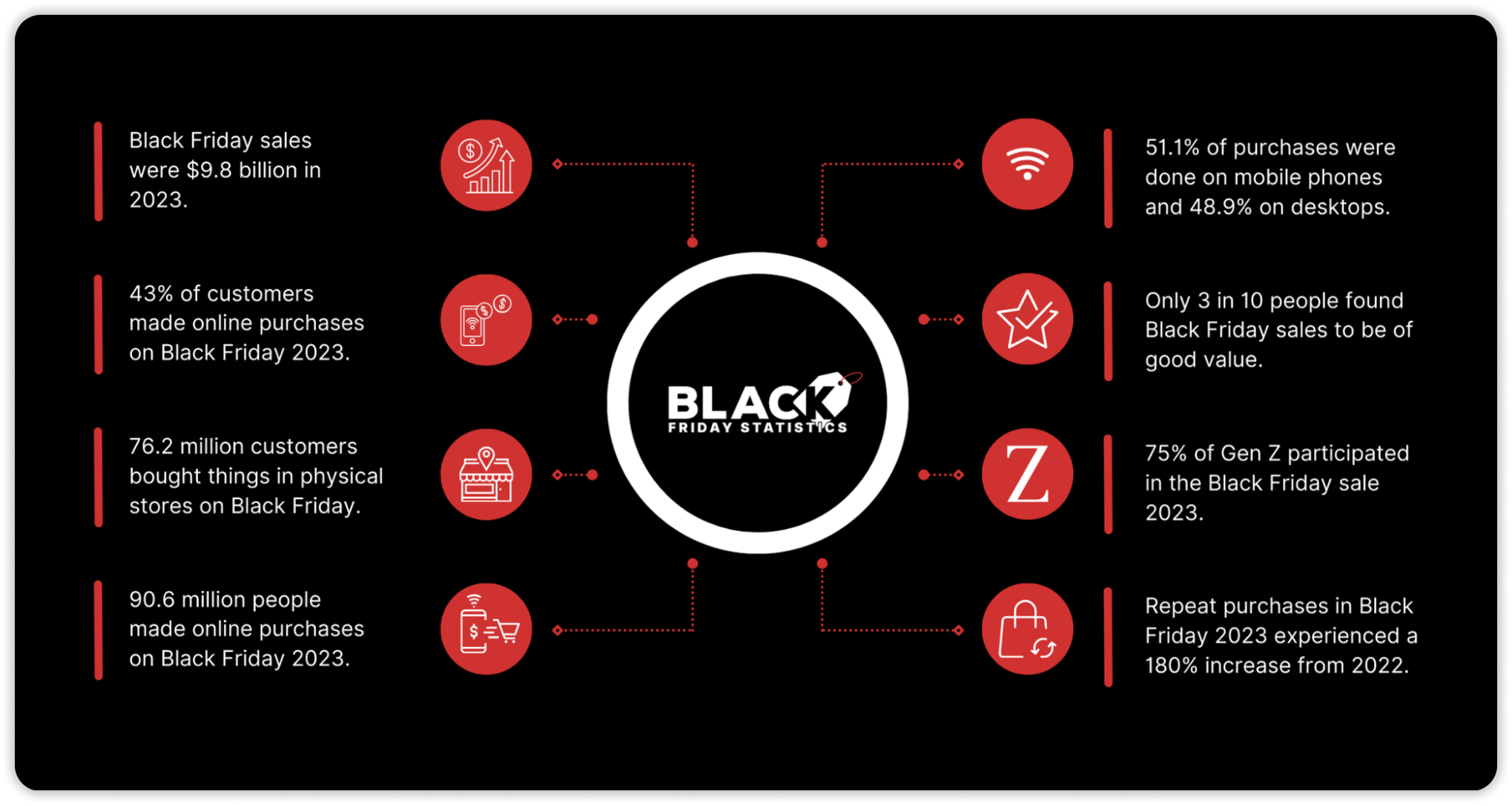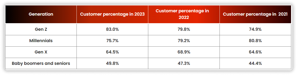 Another notable statistic is that Gen Z is currently one of the most active groups of buyers during Black Friday sales. While in 2022 the percentage was equally shared between Gen Z and Millennials at 79%, by 2023 the number of Millennials buyers decreased to 75% and Gen Z increased to 83%.