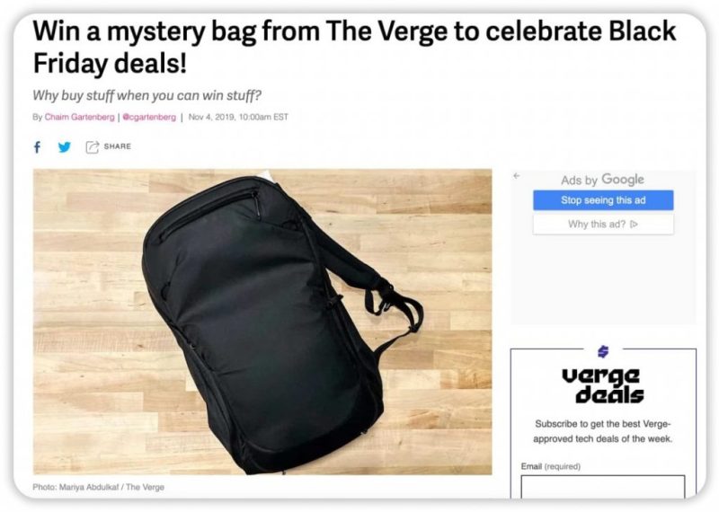Holiday shoppers love surprises! Mystery boxes concept is nothing new, but it is still widely used and loved by audiences. The Verge, a website whose theme is computer hardware, took it all the way up and did a Black Bag giveaway in honor of Black Friday. This fancy backpack was filled with hardware, gadgets, and other tech goods worth hundreds of dollars. Needless to say, there were plenty of people eager to get their hands on the coveted backpack.