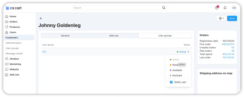 With CS-Cart, you can also control what shipping and payment options each group sees, and offer group-specific discounts. This flexibility helps you create tailored promotions, improving customer satisfaction and increasing sales by catering to different customer needs and preferences.
