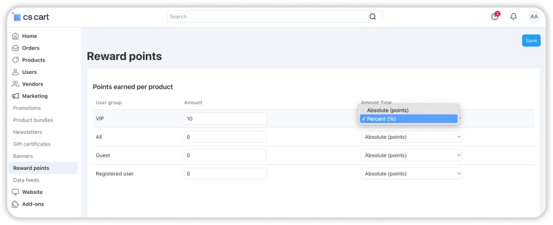 With Reward Points add-on, administrators may grant points for purchasing specific products or categories. And it is you who decides when and how buyers will earn those points. CS-Cart lets you easily set specific conditions that define the number of points customers can get.