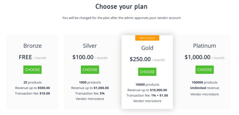 Ever since the vendor plans were added, they didn’t support a flat transaction fee. A marketplace could claim a sum X% from each order (X depended on the vendor plan). Starting with Multi-Vendor 4.9.1, this is no longer the case. You can now take X%, $Y or (X% + $Y) from each order, depending on the vendor plan. See the examples in the screenshot below: