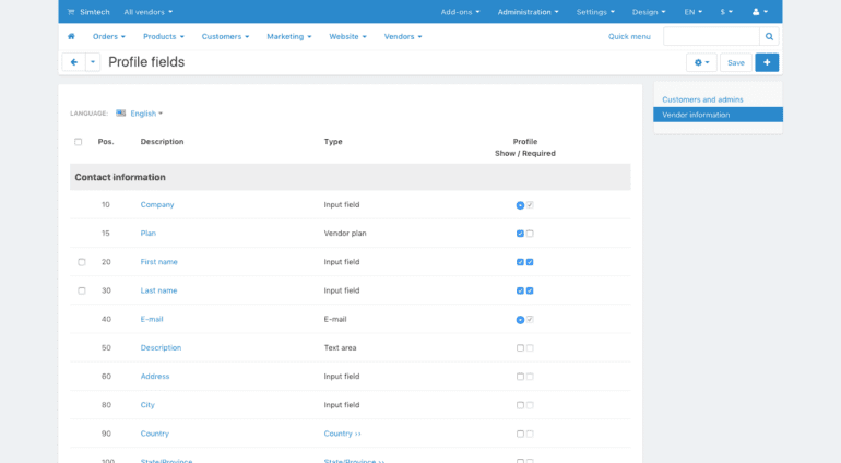 The Administration → Profile fields page now allows you to switch to Vendor information. This is where you’ll be able to add, edit, and remove the fields that appear on the vendor registration form. Just like with profile fields, you can make some of the fields required.