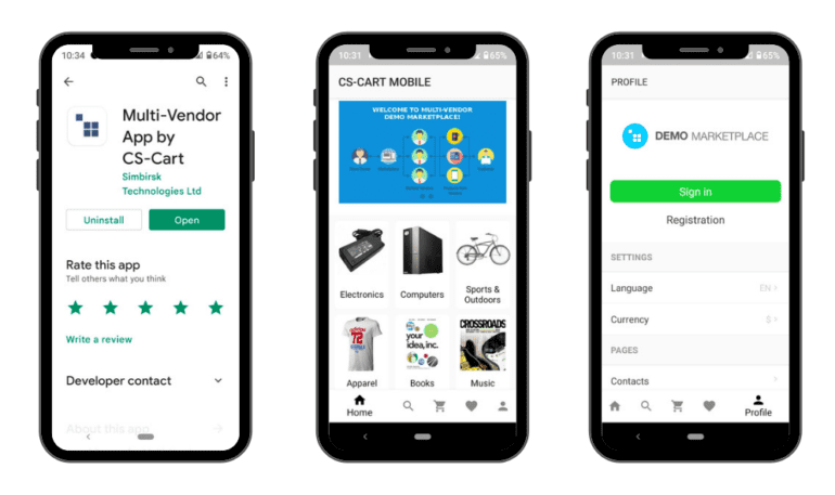 CS-Cart and BigCommerce marketplace apps for mobile phones are available. Both can be built for IOS and Android. Mobile app is included in pricing on Plus, Ultimate and Enterprise payment plans. You can try a free demo version of CS-Cart Multi-Vendor.