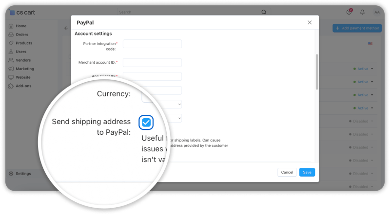 • PayPal gets a customer address. CS-Cart automatically sends a shipping address to PayPal, which helps protect you from fraud. PayPal’s seller protection policies don’t cover payments without a valid shipping address, and PayPal may even hold orders because of this. By sending the address automatically, you avoid those holds and stay protected. Additionally, sending the address to PayPal allows you to print shipping labels directly through PayPal, saving time and making shipping more convenient.