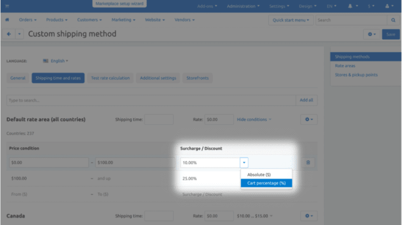 In the new version, we have brought back the ability to specify a surcharge or discount for shipping methods as a cart percentage. For example, it is useful when you need to include the cost of insurance in the shipping cost. Insurance usually is a percentage of the product price, and now you can set it in the shipping method.