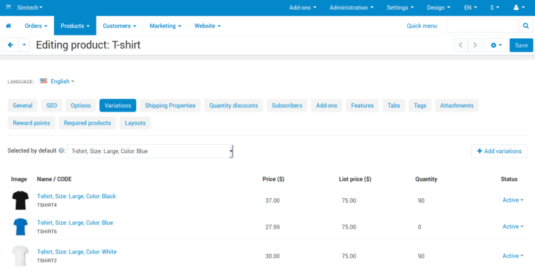 5. The ability to select which product variation must be shown by default has been added. Previously, if a product had multiple variations (for example, a T-shirt with different colors), then the image of the first variation was displayed on the product list, and it was selected by default when a customer visited the product page. Now you can choose which variation to show.