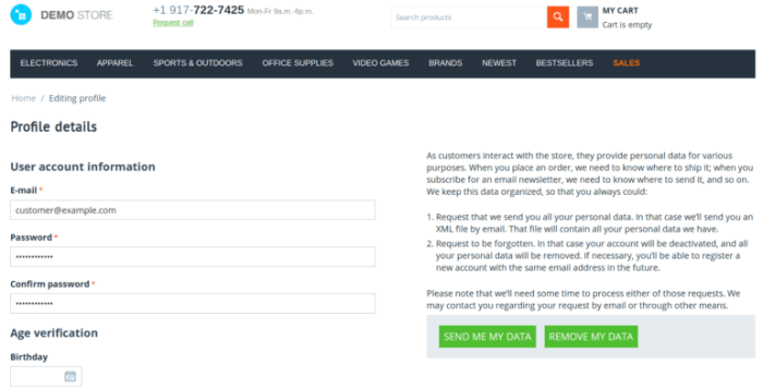 - Previously, customers had to contact you by email to request the removal of their account or a copy of their data in the XML format. But the GDPR requires that it should be as easy to withdraw consent for personal data processing as it is to give it.That’s why we’ve added a block that allows customers to request their data or its removal in a couple of clicks. An email with the request will be automatically sent to the User department email address, and you’ll be able to act on it.Please note that this block won’t appear in your store automatically after the upgrade. For the buttons to appear, you’ll need to add the GDPR block to the Profiles layout page under Design → Layouts. You may also want to update your personal data processing notices to reflect that there is now an easier way to withdraw consent than sending an email.
