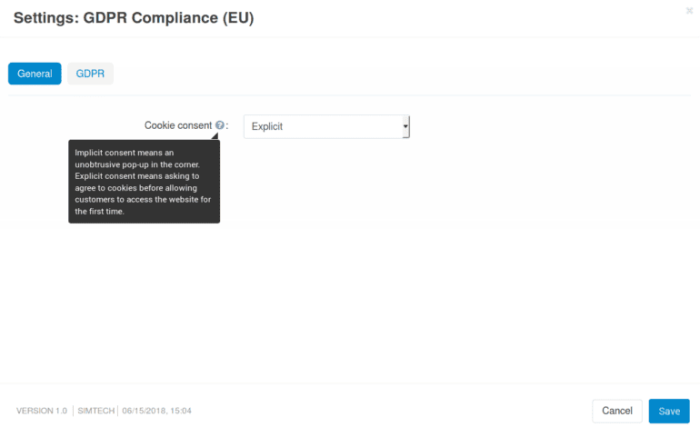 - The setting whether or not to show customers a notification about cookies has been moved from Settings → Security settings to the GDPR add-on.Previously you could either display, or not display the notification (cookies were set either way). Now there’s also a way to ask for explicit consent for cookies, before a customer can enter the site and any cookies are set.